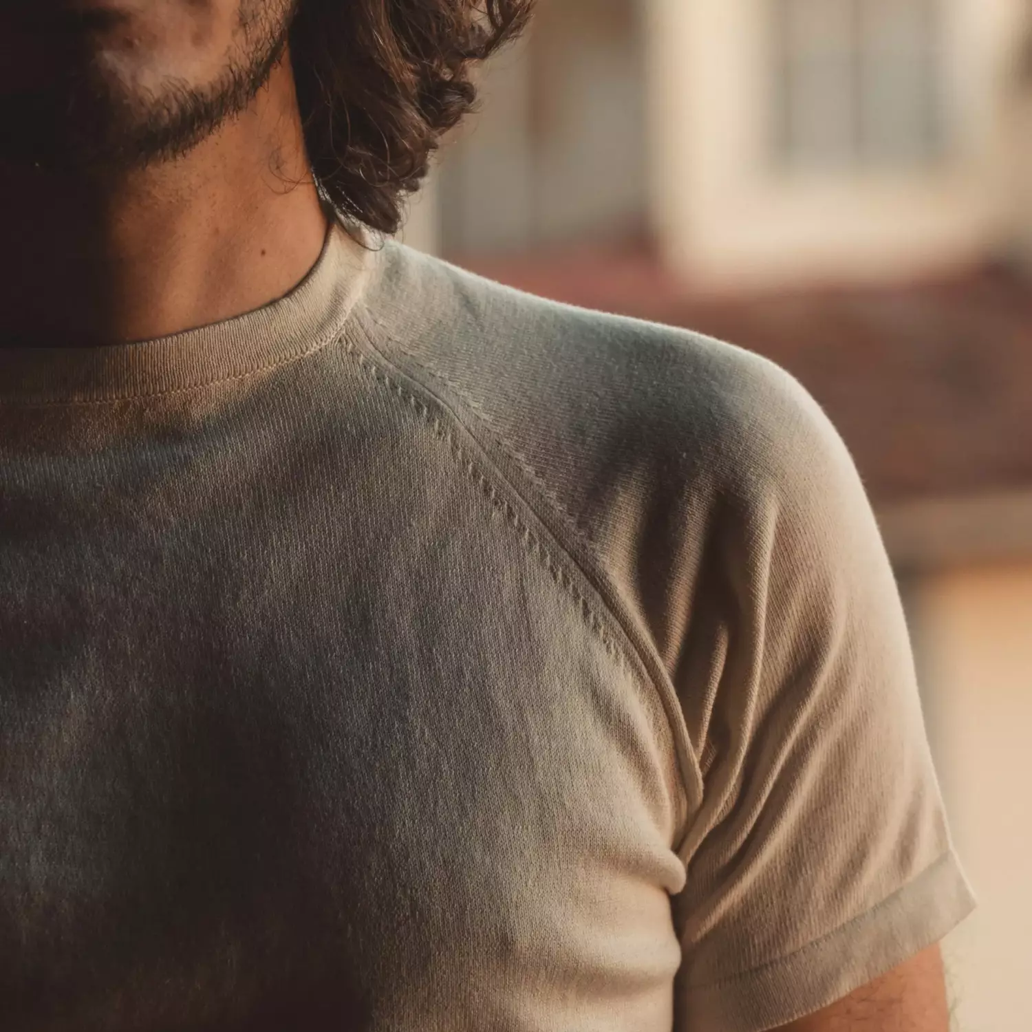 Crewneck short-sleeved design with raglan shoulders and a tighter collar for a clean finish. Longer ribs at cuffs and hem provide a well-fitted shape.