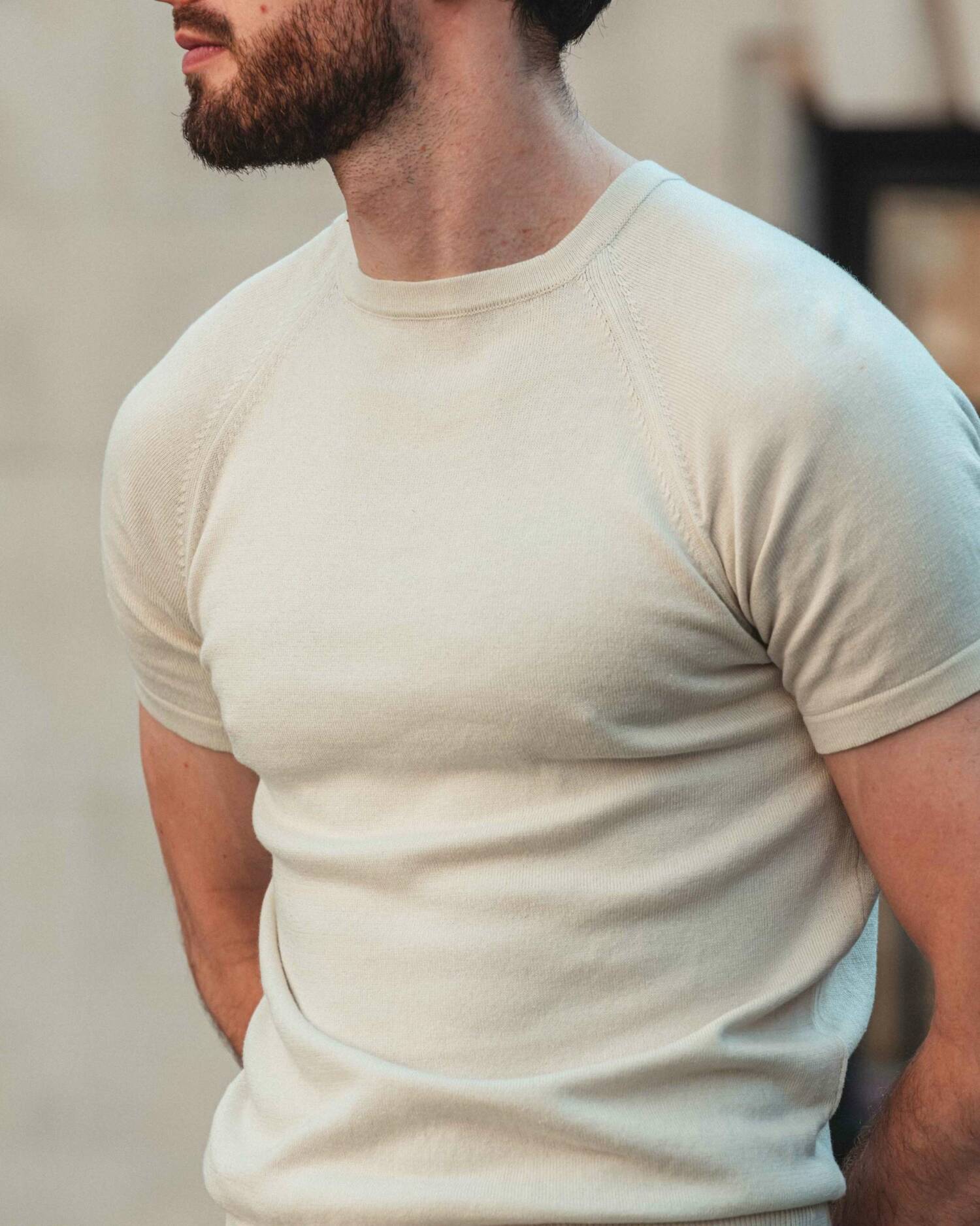 Crewneck short-sleeved top crafted from a luxurious blend of Peruvian Pima cotton and Mulberry silk. Features raglan shoulders for an elegant fit and longer ribs at cuffs and hem to keep the silhouette refined and structured.